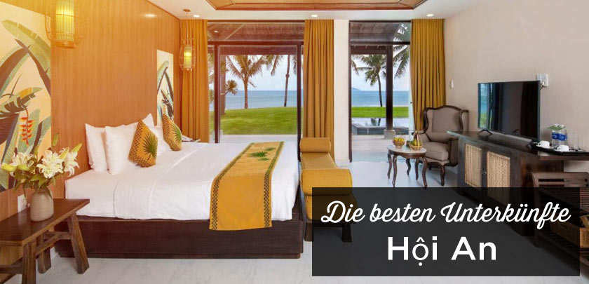 - Palm Garden Beach Resort & Spa: dieses 5-Sterne-Resort liegt inmitten wunderschöner tropischer Gärten direkt am Cua Dai Beach. Geräumige Doppelzimmer und Familienvillen mit privatem Pool ab 170€, Frühstück inbegriffen. Pluspunkte: riesiger Außenpool, privater Strandbereich, exzellenter Service. Eine Top-Wahl für einen luxuriösen Strandurlaub.