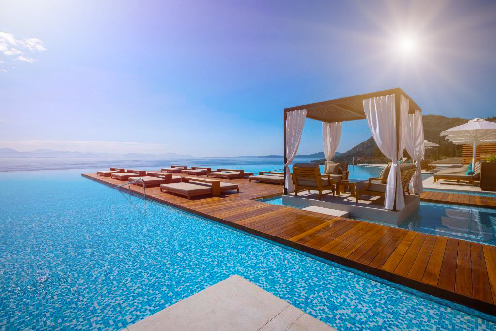 - Angsana Corfu Resort & Spa: This 5-star hotel is set on a hillside overlooking the bay. Luxurious rooms and private pool villas start from 500€. Strong points: stunning infinity pool, exceptional service, world-class spa, fantastic restaurants. This is simply the best luxury hotel in Corfu!