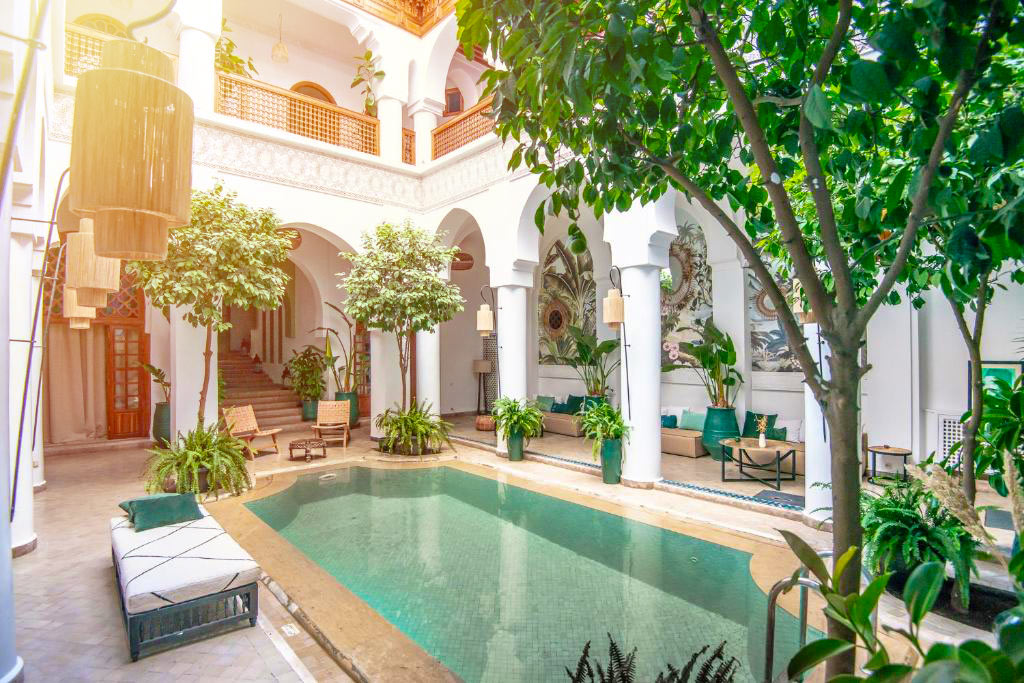 • Les Jardins De La Koutoubia: Este hotel de 5 estrellas está justo al lado de la plaza principal. Habitaciones amplias y elegantes a partir de 300€, desayuno incluido. Puntos fuertes: enorme piscina exterior (poco habitual en la Medina), exuberantes jardines, spa. Perfecto si quieres lujo en pleno centro.