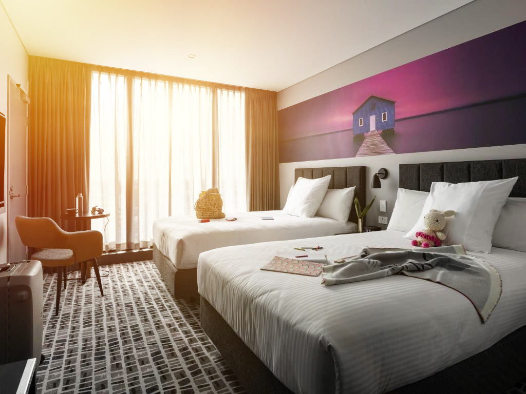 - Novotel Perth Murray Street: Situado en pleno centro de la ciudad. Este nuevo hotel ofrece modernas y amplias habitaciones familiares desde 250€. Puntos fuertes: piscina al aire libre, fantástica ubicación céntrica para explorar la ciudad a pie, habitaciones limpias y cómodas. Esta es mi principal recomendación si viajas a Perth con tu familia.